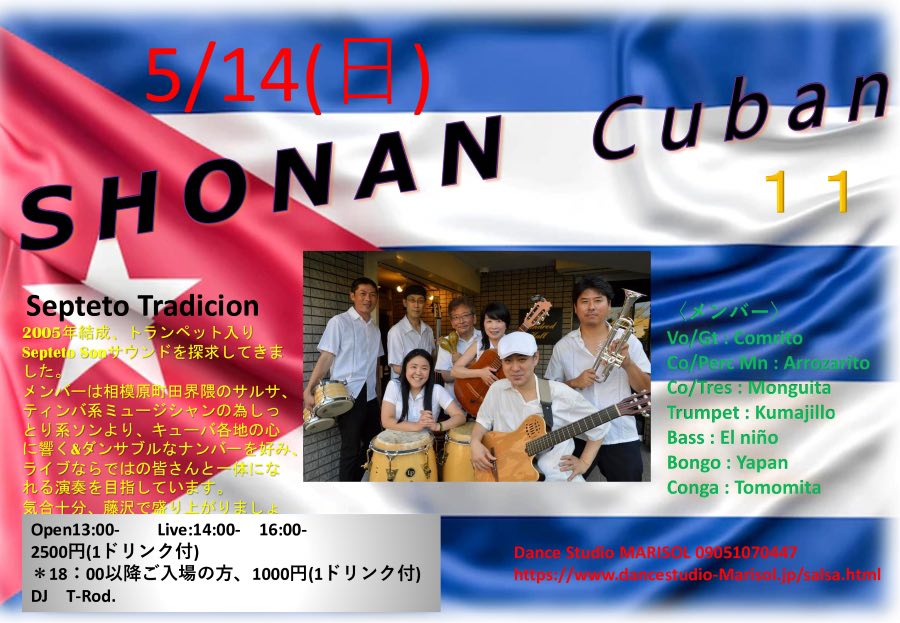 14 5月 2023 5/14 藤沢MARISOL |By Comrito|0 Comment|Live Archive 2回目のMARISOLライブ。前回の諸々の反省をもとにさらなるブラッシュアップを図りました。新アレンジ曲も追加し、最後はシメのConga Santiagueraでいつものように盛り上がりました。 | Share Post 5/5 東林間マイクスライブ 9/17 東林間マイクス