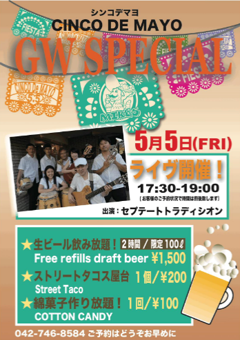 当日は生ビール飲み放題1,500円、ストリートタコス屋台1個200円、綿菓子作り放題1回100円